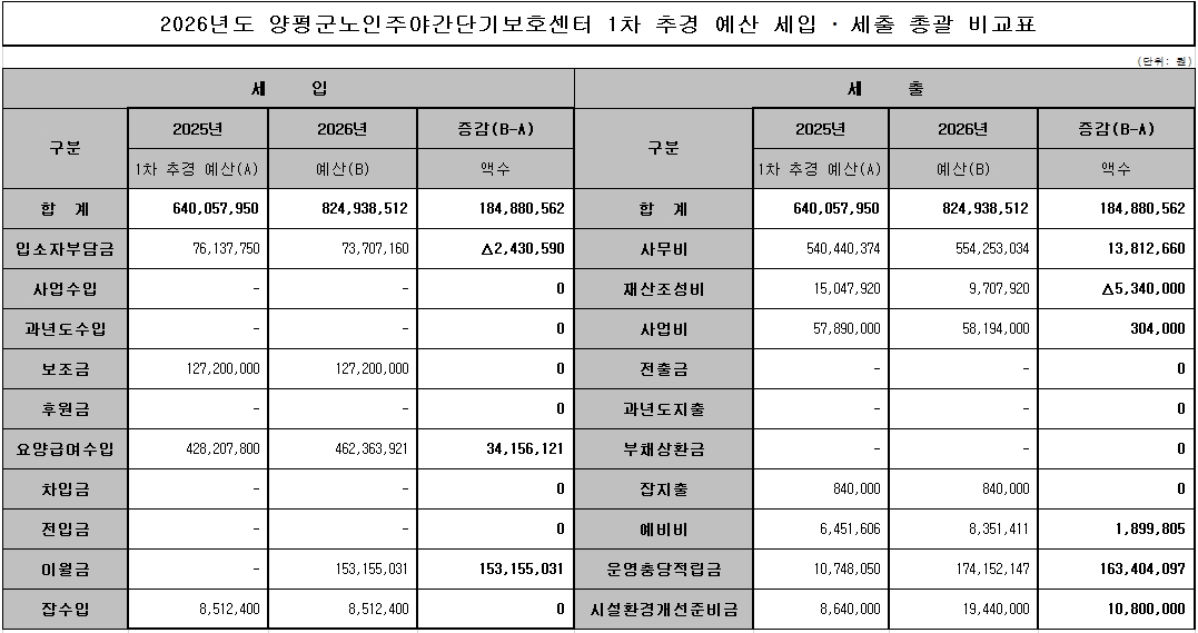 ![]() 양평군노인주야간단기보호센터는 「사회복지법인 및 사회복지시설 재무·회계 규칙」제10조의 제4항에 의거하여 2026년 1차 추가경정 세입·세출 예산을 아래와 같이 공고합니다. |