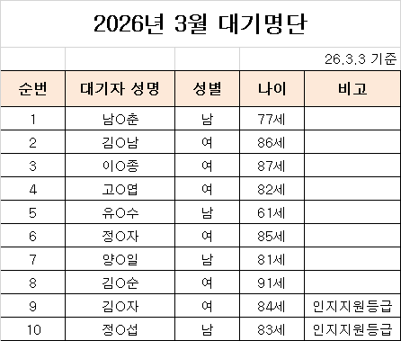 양평군노인주야간단기보호센터 이용대기자 명단 - 2026년 3월
