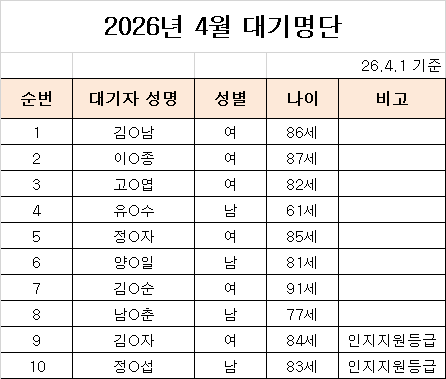 양평군노인주야간단기보호센터 이용대기자 명단 - 2026년 4월